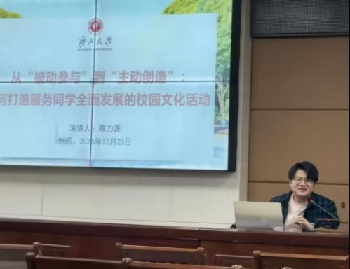 随后,陈力源老师以“从‘被动参与’到‘主动创造’:打造服务同学全面发展的校园文化活动”为题分享经验。他结合自身组织活动的丰富经验,以太阳成集团tyc9728研究生会“姻为遇见”研究生交流会为典型案例,阐述了如何通过活动激发员工主动性,实现从“被动接受”到“深度参与”的转变。